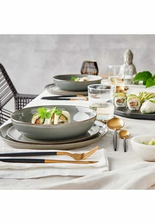 Mit unserer Geschirrserie Native im angesagten minimalistischen Stil kommt der neue Trend auf den gedeckten Tisch! Das 12-tlg. Geschirr-Set aus Steinzeug in der Farbe Grau ist handgefertigt in Portugal. Durch die reaktive Glasur wird jedes Teil der Serie zu einem echten Unikat. Das Set hat eine dünne und hochwertige Scherbe mit einer klaren Formgebung. Durch den unglasierten Boden, wodurch das Rohmaterial zum Vorschein kommt, bringt er einen Manufaktur-Look auf Ihren gedeckten Tisch. Die zusätzlichen Kristalle in der Glasur machen die stilvolle Geschirrkollektion zu etwas ganz Besonderem. Jedes Teil der Serie ist spülmaschinen- und mikrowellengeeignet.