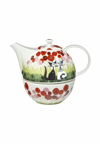Die Teekanne mit Stövchen wurde aus Fine Bone China gearbeitet, dekoriert mit Katzenpaar und leuchtenden Mohnblumen. Das Stövchen hält den Tee angenehm temperiert und lädt zum Genießen ein!Teekanne mit Stövchen – Innamorati tra i papaveri Um die Brillanz der Farben zu schonen, ist Spülen per Hand mit mildem Reinigungsmittel empfehlenswert.Die beliebten Samtpfoten der Künstlerin Rosina Wachtmeister bezaubern mit ansprechender Farbgebung, filigranen Ornamenten und charmanten Details. Verspielt und farbenfroh schleichen sie sich in die Herzen aller Katzenfreunde. Stilvolle Wohnaccessoires in sommerlichen Farben ergänzen die Serie und verbreiten Urlaubsstimmung und Vorfreude auf einen paradiesischen Sommer!Rosina Wachtmeister, 1939 in Wien geboren, wandert im Alter von vierzehn Jahren nach Brasilien aus, wo sie ihre Studienjahre verbringt. Ihre erste große Liebe, ein italienischer Künstler, nimmt die junge Frau mit in seine Heimat. In Capena, einem mittelalterlichen Dorf nördlich von Rom, findet sie ihr neues Zuhause. Seit mehr als 20 Jahren arbeitet Rosina Wachtmeister erfolgreich mit Goebel zusammen und begeistert ihre Fans auf der ganzen Welt.
