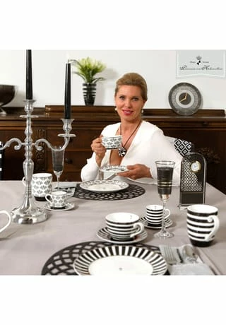 Dessertteller – Dots by Maja Prinzessin von Hohenzollern Der Traum vieler Frauen „Leben wie eine Prinzessin!“ im jungen, royalen und vornehm trendigen Design Um die Brillanz der Farben und die Platinauflage zu schonen, ist Spülen per Hand mit mildem Reinigungsmittel empfehlenswert.Der schwarz-weiße Wohntrend ist zeitlos und doch modern und wirkt dabei elegant und stylisch. Die Schwarz /Weiß – Serie von Prinzessin Maja von Hohenzollern by Goebel setzt Akzente im Bereich Geschenk und Wohnen mit schwarzen oder schwarz/weiß ornamentierten Accessoires wie Kissen, Vasen, Tassen und Tellern und anderer Dekoration. Die schwarzen Kontraste lenken das Auge. Der Tupfen Gold/Silber, der in den Entwürfen immer wieder auftaucht ist ein edler Hingucker und royaler Akzent.I.H. Maja Prinzessin von Hohenzollern ist nicht nur das heutzutage wohl international bekannteste Mitglied der königlichen Familie von Hohenzollern. Neben modernen Interior- Designs entwirft sie auch Produkte für Kinder und Tiere. I.H. Maja Prinzessin von Hohenzollern ist eine große Tierfreundin und setzt sich weltweit engagiert für den Tierschutz ein. Die Lizenzmarke „Maja Prinzessin von Hohenzollern“ steht für ein junges, royales und trendiges Design. Sie transportiert das Lebensgefühl und den Lifestyle einer modernen Prinzessin von heute.