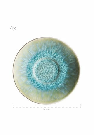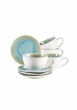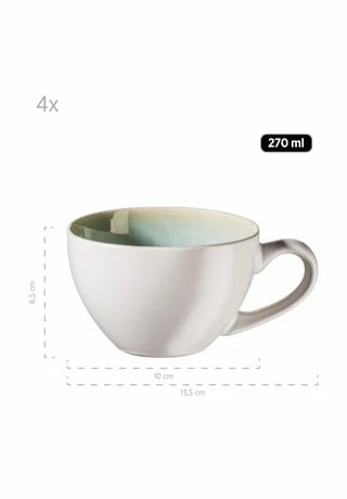 Die österreichische Traditionsmarke MÄSER greift mit der modernen Vintage-Kollektion „Frozen“ den stilvollen skandinavischen Wohlfühltrend auf und zeigt, wie bezaubernd Keramikgeschirr verarbeitet sein kann. Die mattweiße Außenglasur weist eine ganz besondere Haptik auf und versprüht Wärme und Gemütlichkeit in Ihrem Zuhause. Ein echter Hingucker ist die innen bzw. oben von Hand gesprenkelte Glasur, die jedes Teil zu einem Unikat macht. Dieses Set wird in einer sicheren Transportverpackung aus nachhaltigen Materialien versendet. Um eine objektive Vergleichbarkeit zu gewährleisten, beziehen sich unsere Füllmengenangaben immer auf eine randvolle Befüllung. Bitte beachten Sie: Diese Kollektion wird händisch glasiert, wodurch minimale Unebenheiten der Glasur, kleine Einschlüsse und leichte Farbabweichungen auftreten können. Dieses Set besteht aus: 4x Kaffeetasse bzw. Teetasse (270 ml, Ø 10 cm) und 4x Untertasse (Ø 14,5 cm)