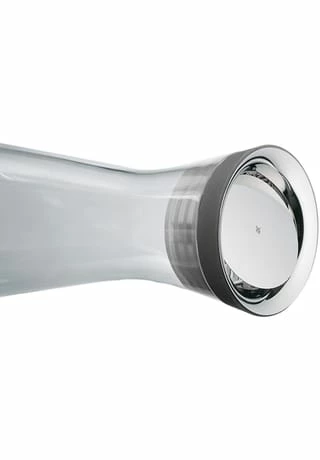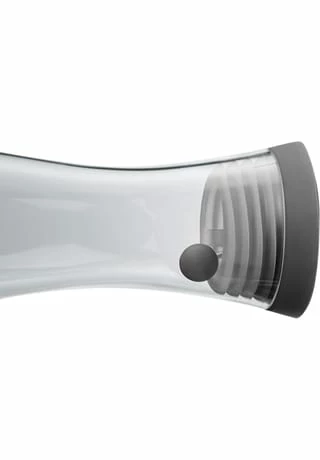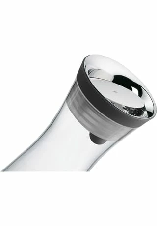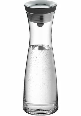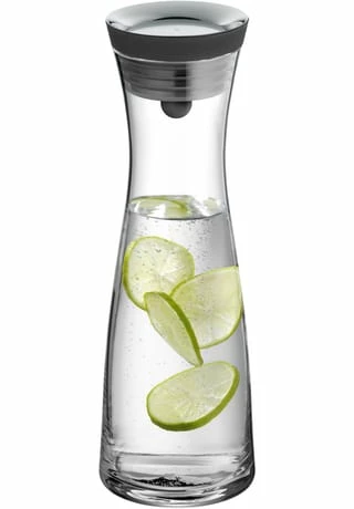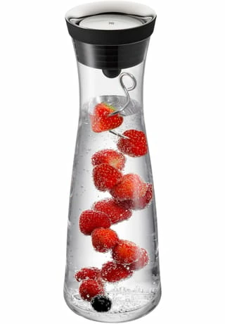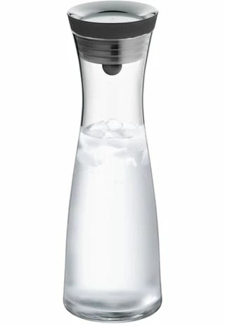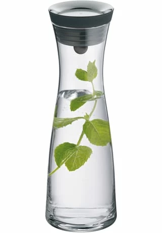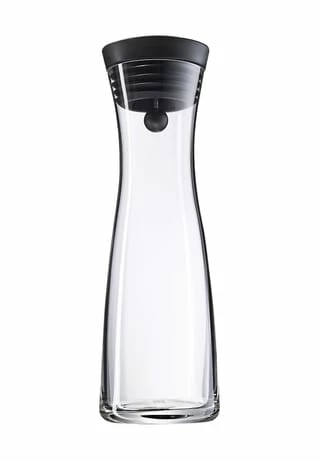 Die klassisch-elegante Basic Wasserkaraffe mit 1 Liter Fassungsvermögen von WMF macht auf dem Tisch eine genauso gute Figur, wie sie beim Einschenken angenehm in der Hand liegt. Dank der großen Öffnung ist das Befüllen schnell erledigt. Besonders praktisch ist auch der schwarze CloseUp Verschluss: Dabei öffnet und schließt der Kippmechanismus beim Eingießen automatisch und das integrierte Sieb hält Eiswürfel, Fruchtstücke oder Kräuterzusätze zurück. Der Verschluss lässt sich zum Reinigen komplett zerlegen und in der Spülmaschine reinigen. Außerdem passt die Wasserkaraffe platzsparend in das Getränkefach nahezu jeden handelsüblichen Kühlschranks.
